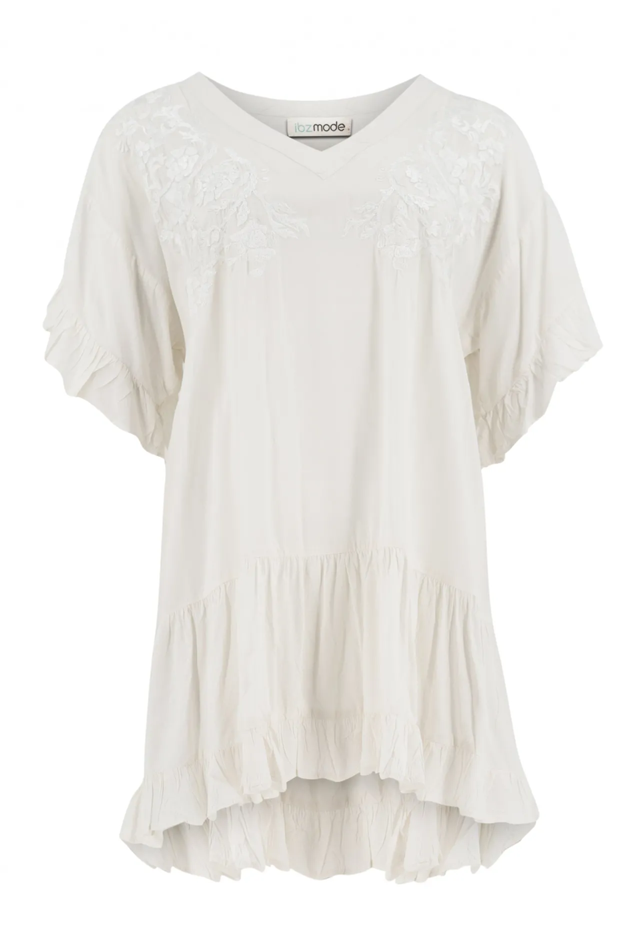 Entdecke die Tunika Melina Navarra Ivory, eine perfekte Ergänzung für deine Garderobe. Diese Tunika ist aus einem luftigen Stoff gefertigt, der für ultimativen Komfort und Atmungsaktivität sorgt. Die detaillierten Stickereien verleihen ihr einen stilvollen Touch, während der V-Ausschnitt und die Rüschenärmel für feminines Flair sorgen. Sie eignet sich sowohl für legere als auch für elegante Anlässe. Nimm diese zeitlose Tunika in deine Kollektion auf und strahle mühelose Eleganz aus!