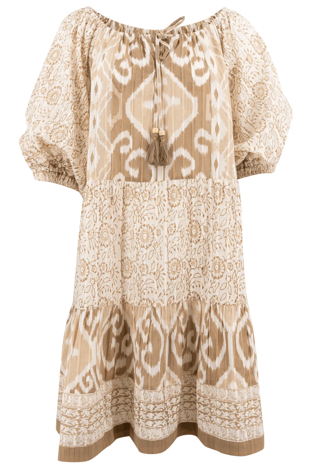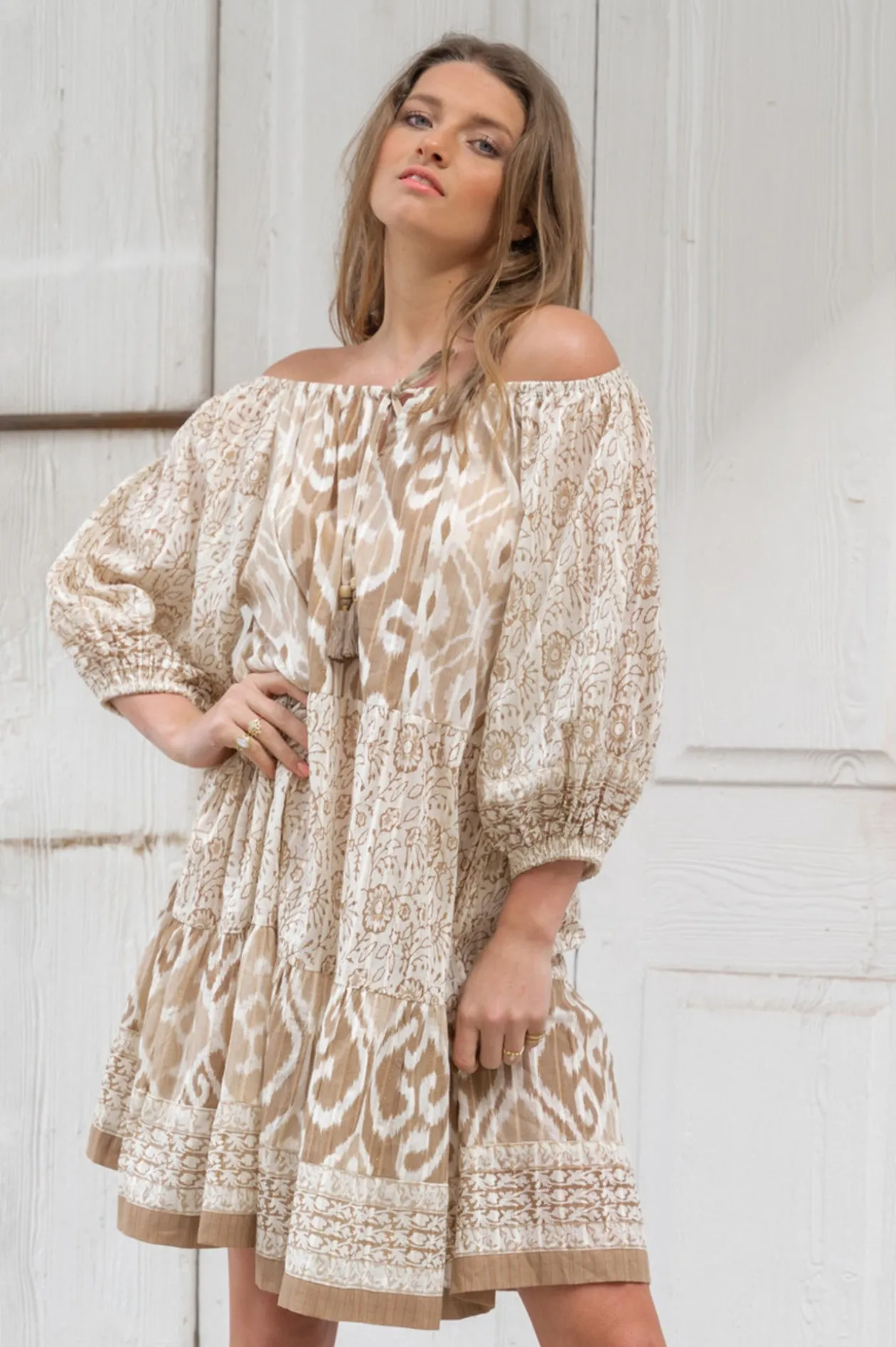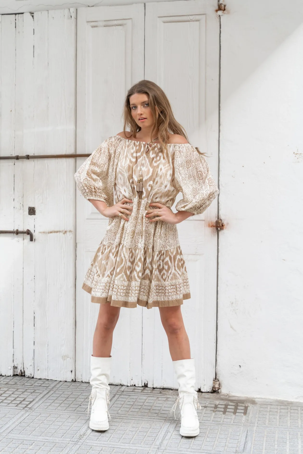 Entdecke den ultimativen Ibiza-Vibe mit der Tunika Tibby Natural, einem schulterfreien Meisterwerk mit schimmerndem Lurexgarn und einem eleganten Barockprint. Die 3/4-Ballonärmel und die zierlichen Bänder mit Quasten verleihen deinem Look einen verspielten Twist. Kombiniere es mit Sandalen für ein mühelos stilvolles Outfit. Spüre die Freiheit!