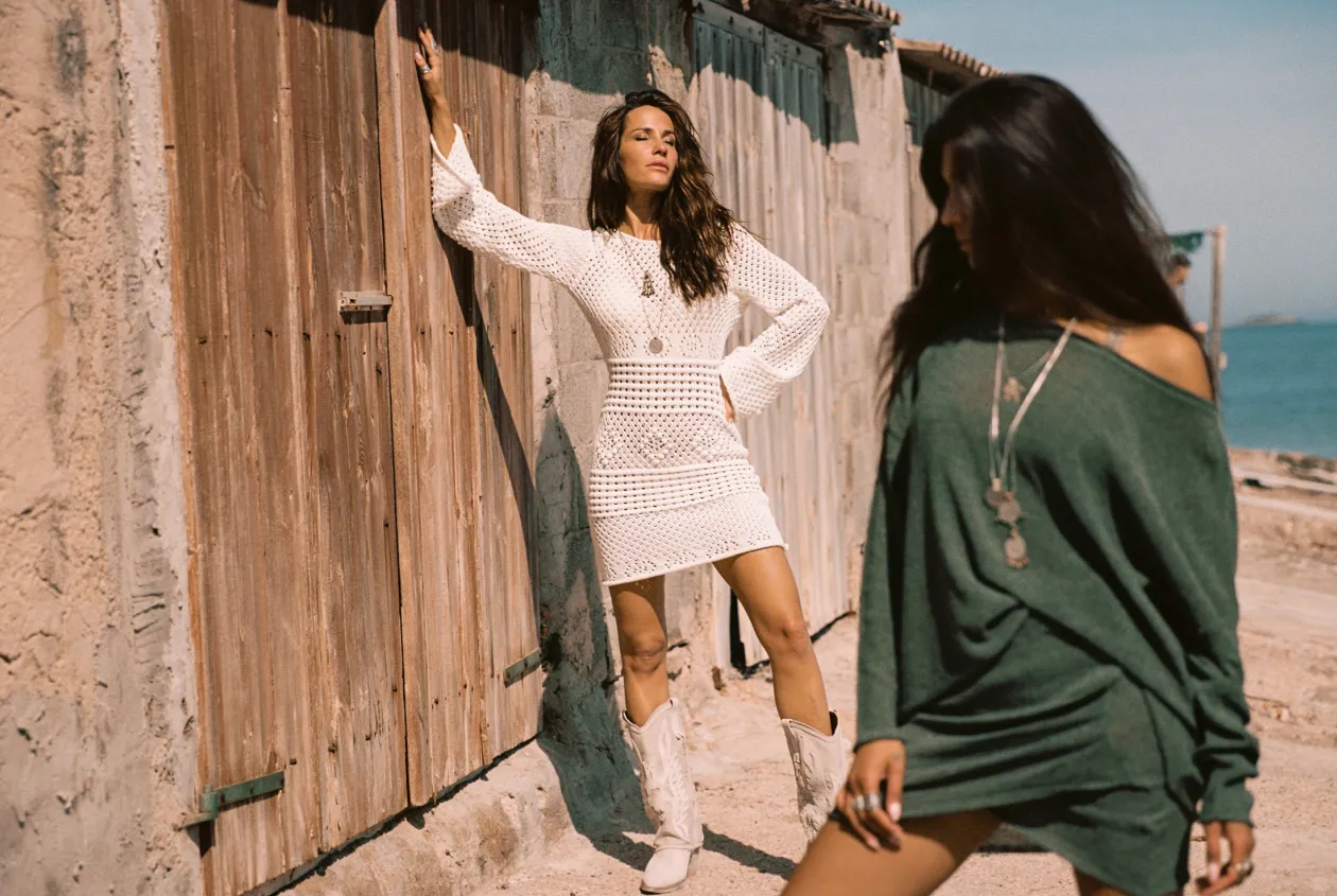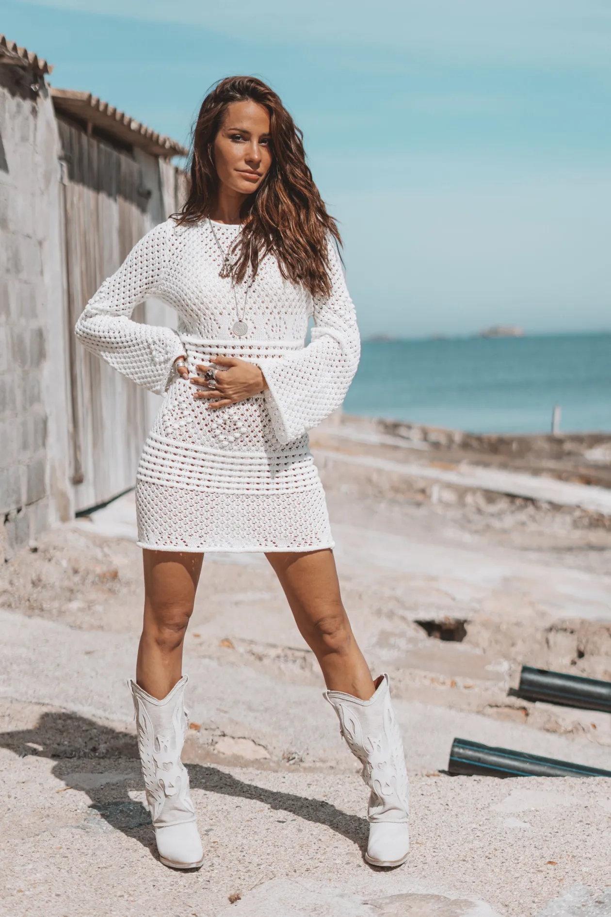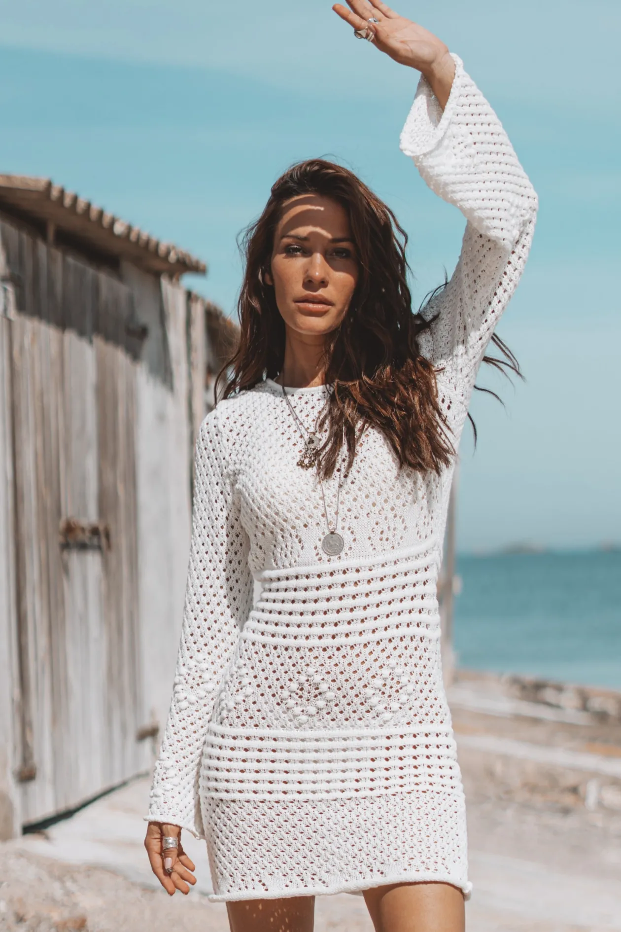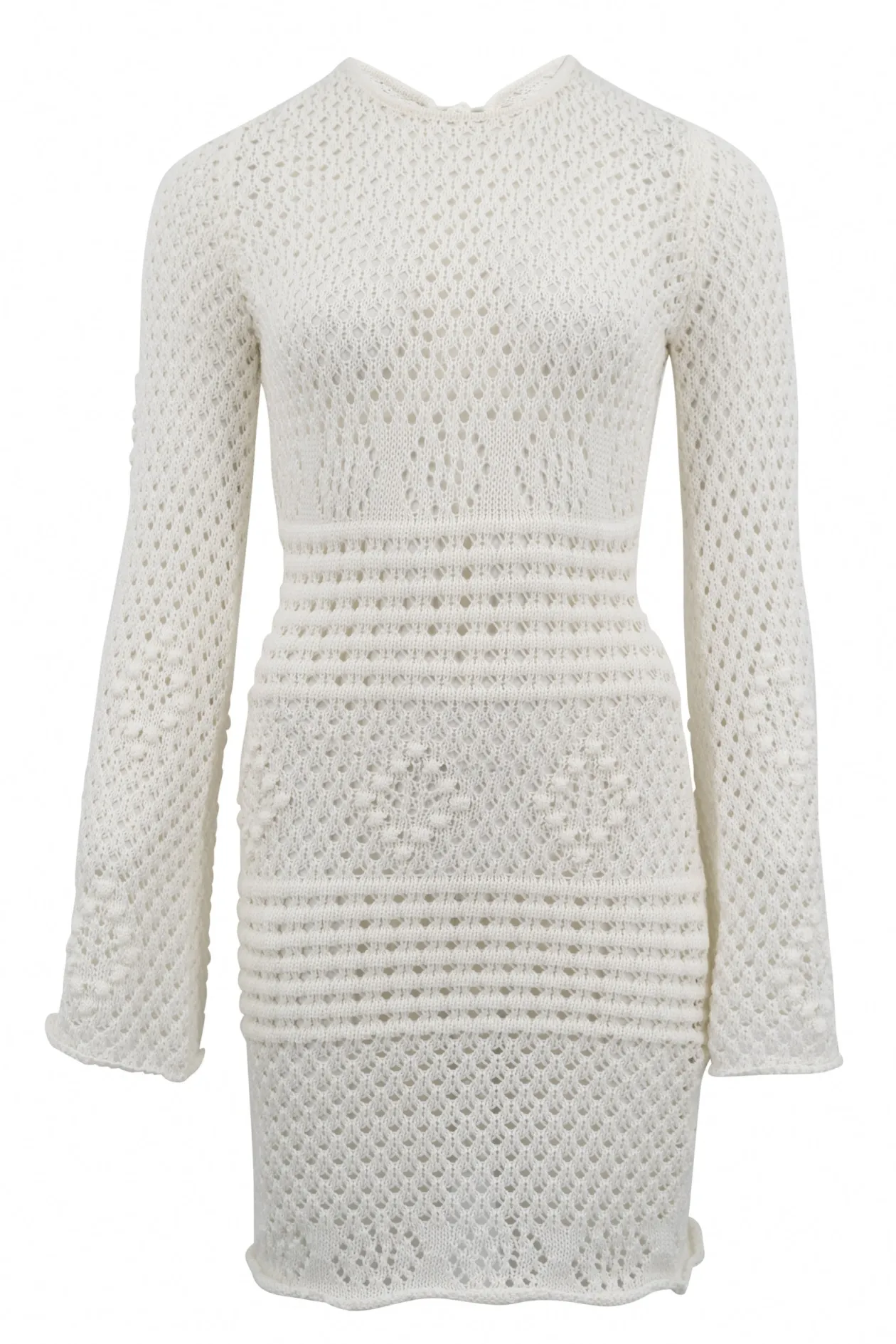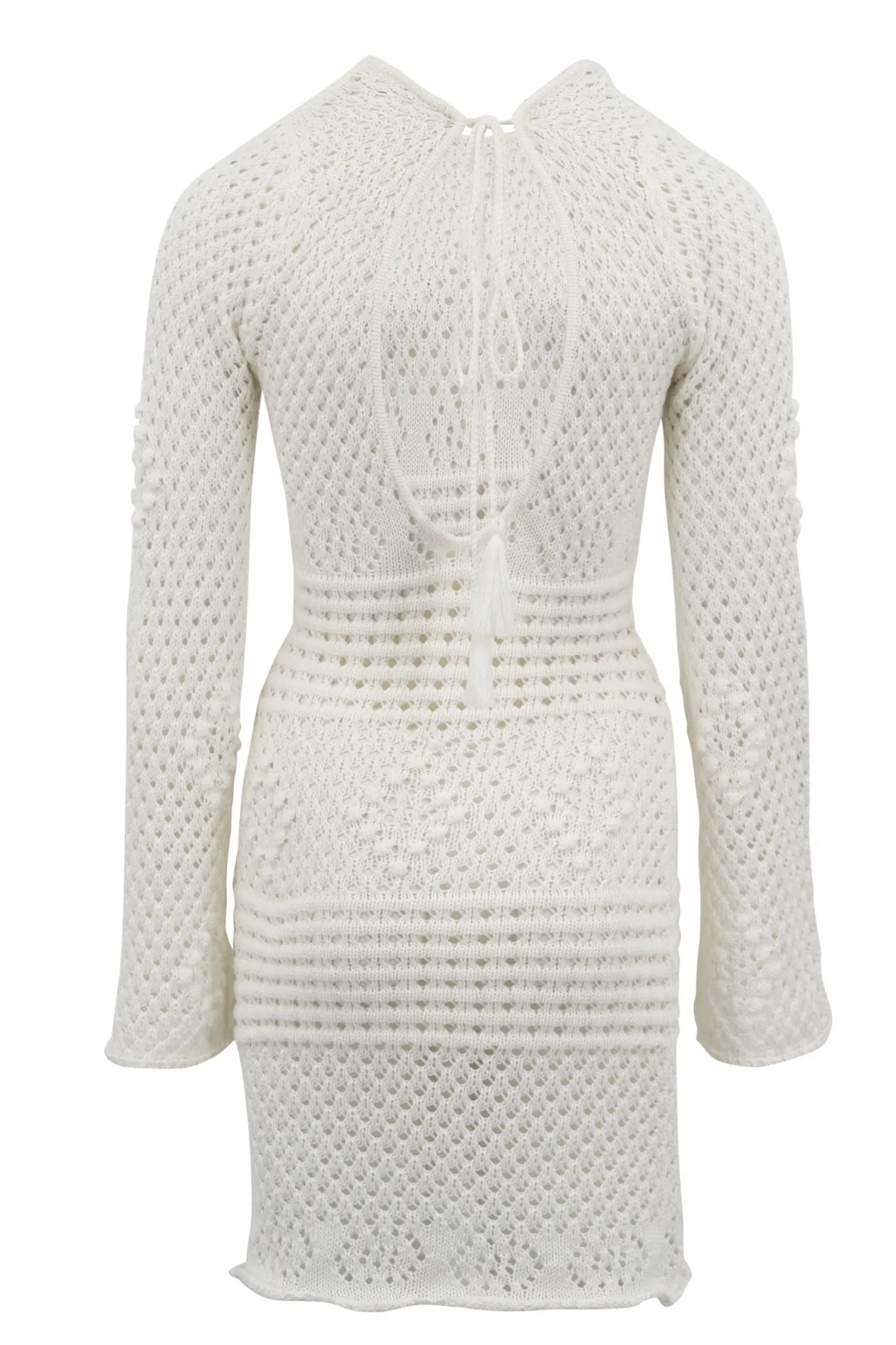 Erlebe die Magie des Zayn Ajour Summer Dress Off White, ein raffiniertes Strickkleid, das perfekt für jeden Sommeranlass ist. Mit seinen durchbrochenen Details, den ausgestellten Ärmeln und dem verführerischen offenen Rücken wirst du mühelos Boho-Chic ausstrahlen. Kombiniere es mit Sandalen für einen lässigen Look oder mit Absätzen für einen glamourösen Abend. Umarme deinen einzigartigen Stil!